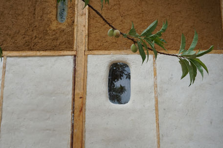 Técnicas: Cimentación de piedra y cal, muros de adobes reutilizados,cubierta de teja artesanal, estructura de madera carpintería , piso de cal.